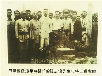 历任漳浦县第一、第二等区区员,抗日战争初期升任龙溪县第三区区长、漳平县县长的陈志谟,于1920年还与将士留下猎虎照片。泛黄的照片上,一只金黄的老虎,被捆得结实,放在队伍前面。