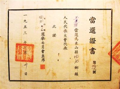 “这张证书是我父亲王连桂1953年当选乡人大代表时获得的。”64岁的王先生告诉笔者,“数十年前的选民证可能个别人有收藏,但是人大代表名额很少,更不要说能够保存到今天了。”